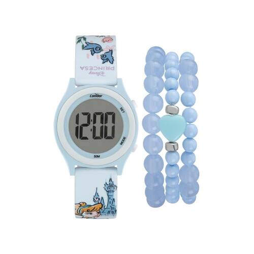 Relógio Condor Feminino Ref: Cobj3572ag/k8a Infantil Cinderela DESCRIÇÃO DO PRODUTO: Caixa de Resina Azul Clara com detalhes em Branco Pulseira de Silicone Azul Clara Estampada com personagem Cinderela Fundo de Parafusado Diâmetro / Largura da Caixa: 36.00 MM Funções: Digital, Calendário Resistente à água 5 ATM Alimentação do Maquinário: Bateria Maquina Japonesa Mostrador Azul Claro com detalhes em preto Linha: Condor Kids + Pulseira de miçanga Infantil Imagem meramente ilustrativa da pulseira Produto Oficial Licenciado Disney Classificação Indicativa: A partir de 4 Anos de Idade de 1 Ano Marca: Não Informado