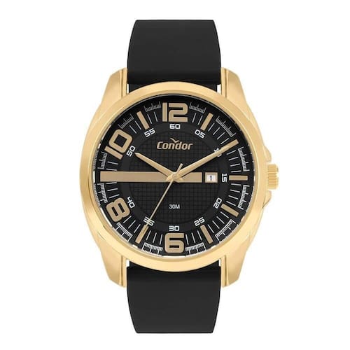 Marcas: Condor Modelo COPC32DB/5P Gênero: Masculino Cor: Dourado Características Vidro: Cristal Mineral Material da caixa: Metal Cor da caixa: Dourado Material da pulseira: Silicone Cor da pulseira: Preto Cor do mostrador: Preto Diâmetro da caixa: 4,8 cm Mecanismo: Quartz Funções: Analógico / Calendário Resistência à água: 3 ATM Pode Lavar as Mãos: Sim Pode Usar em Água Corrente: Sim Pode Usar na Piscina: Não Pode Usar em Mergulho Profundo: Não Calendário: Sim