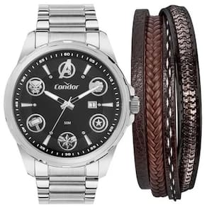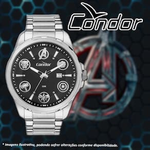 Os super heróis da Marvel chegaram nos Kits Condor Par Perfeito Modelo com mostrador preto com símbolos dos Vingadores na posições das horas, pulseira de aço 3 links prata, caixa 48mm e 50 metros de resistência à água e ainda acompanha um lindo conjunto de pulseiras. Perfeito para quem é fã desses incríveis personagens.