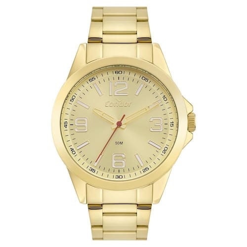 Relógio condor masculino ref: co2035nty/4x casual dourado Descrição do produto: Caixa de metal Pulseira de aço Fundo Diâmetro / largura da caixa: 45.00 mm Funções: analógico Resistente à água 5 atm Alimentação do maquinário: bateria Maquina japonesa Mostrador dourado com números de 1 ano Marca: Não Informado Ean: 7891530885495
