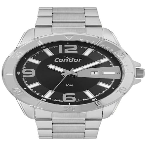 Relógio Condor Speed masculino em banho prateado com pulseira de aço. Seu aro robusto e números grandes dão um toque moderno e esportivo ao modelo, perfeito para os homens que procuram se destacar em qualquer ocasião. Possui calendário, resistência à água de 3 ATM e tamanho de caixa 48mm.