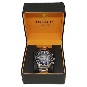 Relógio Cronógrafo Masculino de Aço Tuguir Analógico 23-2231 Prata e AzulMarca: Tuguir Categoria: Analógico Analógico: Sim (1 Horário) Ponteiros Fluorescentes: Sim Digital: Não Cronômetro: Sim Luz: SelecioneResistente à Água: 5 ATM (Pode ser utilizado para nadar no raso, por pouco tempo submerso) - Respingos: Sim - Chuva: Sim - Lavar Carro: Sim - Lavar Louça: Sim - Natação: Sim - Mergulho: Não Característica do Vidro: Cristal Mineral Tipo de Fecho: Dobrável com Botão Cor da Caixa: Prata Material da Caixa: Aço Formato da Caixa: Redondo Diâmetro da Caixa: 41,00 (mm) Espessura da Caixa: 11,00 (mm) Cor da Pulseira: Prata Material da Pulseira: Aço Largura da Pulseira: 17,50 (mm) Comprimento Máximo da Pulseira: 270,00 (mm) Alimentação: Bateria Interna Peso Líquido: 0,120 Kg Modelo: 23-2231 Cor Predominante: Prata Cor Diferencial: Azul Garantia: 12 MesesConteúdo da Embalagem: 01 Relógio 01 Embalagem 01 Termo de Garantia