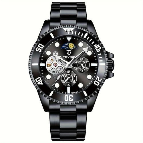 Especificações [Design sofisticado]: Este relógio apresenta um estilo elegante que não só é bonito, mas também extremamente funcional com fase lunar e cronógrafo de 24 horas. [Resistência imbatível]: Desfrute da segurança de um relógio resistente à água até 30 metros, ideal para o uso diário e resistente a pequenos incidentes líquidos. [Brilho noturno]: Os marcadores que brilham no escuro garantem que você possa consultar as horas mesmo nas noites mais escuras, proporcionando visibilidade em qualquer situação. [Operação mecânica]: Aproveite um relógio sem a necessidade de bateria, graças ao seu movimento automático, que capta energia através do seu movimento constante. [Durabilidade duradoura]: Com uma pulseira de aço inoxidável e uma caixa de liga, este relógio foi feito para durar, oferecendo a você anos de uso e estilo.