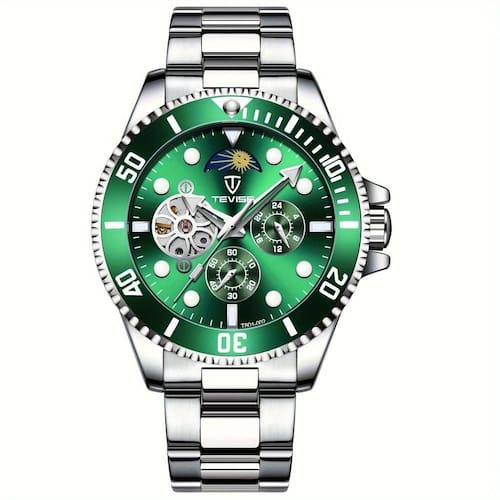 Especificações [Design sofisticado]: Este relógio apresenta um estilo elegante que não só é bonito, mas também extremamente funcional com fase lunar e cronógrafo de 24 horas. [Resistência imbatível]: Desfrute da segurança de um relógio resistente à água até 30 metros, ideal para o uso diário e resistente a pequenos incidentes líquidos. [Brilho noturno]: Os marcadores que brilham no escuro garantem que você possa consultar as horas mesmo nas noites mais escuras, proporcionando visibilidade em qualquer situação. [Operação mecânica]: Aproveite um relógio sem a necessidade de bateria, graças ao seu movimento automático, que capta energia através do seu movimento constante. [Durabilidade duradoura]: Com uma pulseira de aço inoxidável e uma caixa de liga, este relógio foi feito para durar, oferecendo a você anos de uso e estilo.