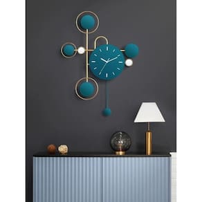 Sua estrutura tem formato superdimensional, sua base em metal dourado, círculos em verde e dois mini espelhos, relógio central também em fundo verde, com números branco. Uma peça decorativa de fino acabamento e requinte. O design geral apresenta um desenho geométrico que exibe totalmente uma aparência bonita e elegante.