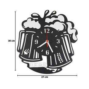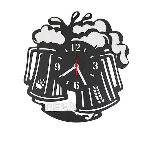 Relógio em MDF Preto à pilha (modelo AA) com ponteiro das horas na cor Branca e o dos segundos em vermelho, além dos numerais vazados que na colocação em uma parede de cor neutra e clara é possível ter a visão das horas em maior nitidez. Com Símbolos de canecas de chopp com espuma na cor branca, assim como a escrita Beer (cerveja).