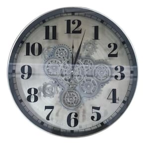 Muito elegante, arte em círculo em metal na cor cinza, com borda e números em preto, visor em vidro, com fundo com uma engrenagem que funciona simétricamente aos ponteiros, tornando a peça criativa e chique.