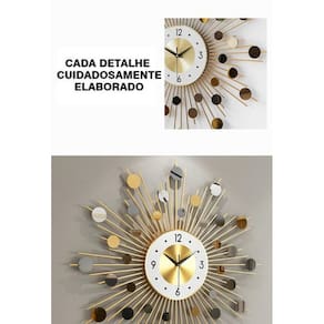Diâmetro total: 70 cm Diâmetro relógio central: 24 cm . Cores: Estrutura: dourada Fundo do relógio: branco e dourado Números: preto