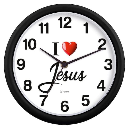 Relógio de parede analógico herweg i love jesus 6669 034 Relógio de parede herweg 22cm i love jesus 6669-034 Características gerais do produto: alimentação: pilha aa não inclusa funcionalidade: mecanismo step com tic tac mas muito silencioso material: plástico pintado; visor de acrílico medidas: a: 22 x l: 22 x p: 4cm observações: inclui suporte para pendurar; botões de regulagem na parte traseira referência do produto: 6669-034 cor borda: preto / fundo: branco escrita i love jesus : 12 meses de de fábrica