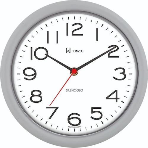 Relógio de Parede Cinza Silencioso Herweg 660039-024 Tamanho: 22cm de diâmetro X 4cm de espessura Máquinário: Sweep Contínuo Cor do fundo: Branco Cor da Estrutura: Cinza Base: Plástico injetado Vidro: Acrílico Usa pilha AA Fabricado por HERWEG RELÓGIOS com de 1 Ano Marca: Não Informado Ean: 7897280347399
