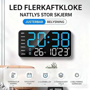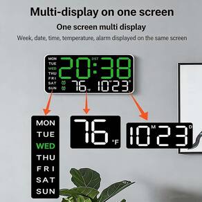 Material: ABS Cor: branco Tamanho da embalagem: 32 x 12 x 5 cm Peso da embalagem: 0,6 kg Lista de embalagem: 1 x relógio de parede digital LED O grande display LED mostra a hora, a data, o dia da semana e a temperatura com clareza, facilitando a leitura do outro lado da sala em salas de estar, quartos ou escritórios. A função de alarme duplo permite que você defina dois horários de despertar separados, ideais para casais, famílias ou horários diferentes de dias úteis e finais de semana. Os níveis de brilho ajustáveis garantem uma visualização confortável durante o dia e a noite, reduzindo o brilho e protegendo seus olhos. O design moderno sem moldura suporta tanto a montagem na parede quanto a colocação na mesa, combinando perfeitamente com os estilos contemporâneos de decoração doméstica. A exibição integrada do horário de verão e do calendário acompanha automaticamente as mudanças sazonais e a programação diária para maior comodidade.