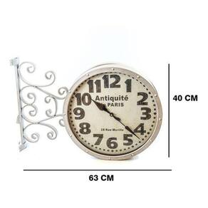 Relógio De Parede Duas Faces Modelo Estação Antiquité Paris O Relógio de Parede modelo de Estação com mostrador dupla face em um suporte é um acessório elegante e conveniente para o corredor, cozinha, varanda, hall... Tanto o morador que entra como pra quem sai da casa ou o hóspede, verá imediatamente a hora graças a dois mostradores localizados em ambos lados Esses relógios são chamados de Relógios de Estação, porque no século 19 eram frequentemente precisamente em estações de trem e estações ferroviárias. Modelo traz o design europeu Antiquité Paris Feito em metal e vidro, seu mecanismo de relógio quartzo, com fonte de alimentação em 2 pilhas AA não inclusas Altura: 40 cm Largura: 63 cm REF: F637 Marca: Não Informado Ean: 7899343889884