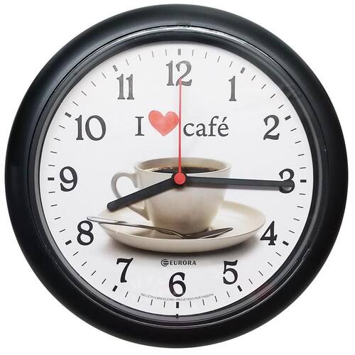 Relógio De Parede Eurora Preto Redondo Café 6586-34 Marca: eurora - nacional Codigo: 6586-34 Medidas: 24 x 24 x 4 cm Base: plástico injetado Visor : acrílico Mecanismo: step Estilo: moderno Botões de regulagem na parte traseira do produto Usa 1 pilha aa 1,5v - pequena não inclusa Ean: 7898906495869