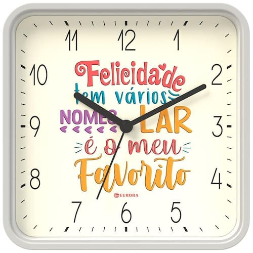 Relógio De Parede Eurora Ref: 6596-021 Branco Quadrado Lar DESCRIÇÃO DO PRODUTO: Medidas: 22A x 22 L 3,2E cm Características Técnicas: Usa pilha AA Mecanismo Step Tic-Tac Produto Nacional Informações sobre o produto: Relógio de parede Base em Plástico Injetado Botões de regulagem na parte traseira do produto Cor da Base: Branco Cor do Mostrador: bege com inscrição Felicidade tem vários nomes Lar é o meu favorito e números em preto Para a decoração do seu lar de 1 ano