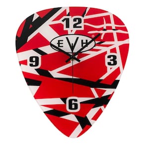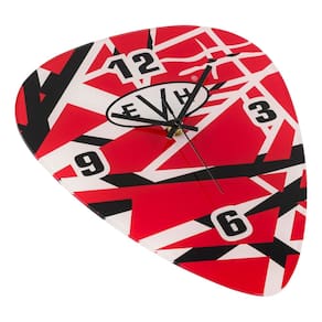 - Relógio de parede icônico EVH no formato de palheta de guitarra com o padrão lendário de listras Frankenstein em vermelho, branco e preto.