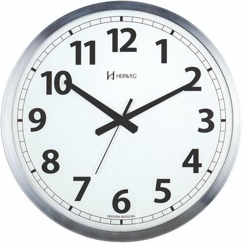 Relógio de Parede Herweg 6713-079 Tamanho: 41,5cm de diâmetro X 4cm de espessura Máquinário: Step Tic-tac Cor do fundo: Branco Cor da Estrutura: Alumínio escovado Base: Alumínio Vidro: Mineral Usa pilha AA 1 Ano de Garantia do Fabricante Ean: 7909463110307