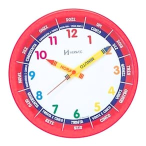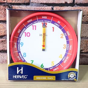 Marca: HERWEG Modelo: 6690 - 269 Tipo de relógio: Analógico Alarme: Não Cor da caixa: Vermelho Cor do fundo: Branco Tema: Didático Material da Caixa: Polímeros diversos Características do vidro: Acrílico Tamanho da caixa: 26 cm Espessura da caixa: 5 mm Peso: 355 Gramas Alimentação: 1 pilha1 AA 1,5 volt – a pilha não acompanha o produto Garantia do Fabricante: 12 meses Prazo de validade: Indeterminado Fabricante: HERWEG – Indústria Brasileira