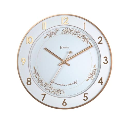 Relógio de parede herweg ref: 6873-318 dourado Descrição do produto: Medidas: 34,6d x 5e cm Características técnicas: Usa pilha aa Mecanismo sweep silencioso Produto nacional Informações sobre o produto: Relógio de parede Base em plástico injetado/pintado Detalhes do mostrador em alto relevo Botões de regulagem na parte traseira do produto Cor da base: branco Cor do mostrador: branco ornamentado com todos os números e frase entre os minutos, a vida se faz Ideal para a decoração de ambientes de 1 ano Marca: Não Informado Ean: 7897280327537