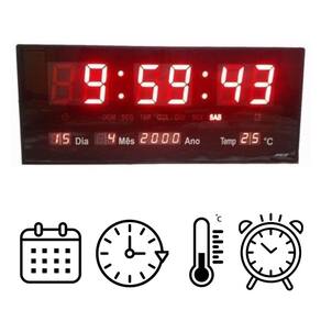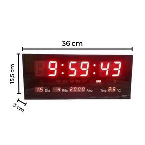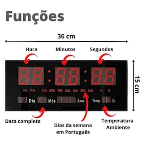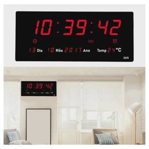 Relógio de parede digital, perfeito para cozinha, sala ou academia.Silencioso e grande, oferece fácil leitura com números claros e precisão no funcionamento.Adicione estilo e funcionalidade ao seu ambiente com este relógio moderno e prático.CARACTERÍSTICAS👉 Digital: Display de números.👉 Alarme até 4 programações👉 Alimentação: Fonte 5v (funciona apenas ligado na tomada);👉 Temperatura👉 Hora👉 Dia, Mês e Ano👉 CalendárioBENEFÍCIOS?? Leitura rápida: Números grandes.?? Silêncio total: Sem ruídos.?? Facilidade de uso: Operação simples.DIMENSÕES DO PRODUTO? Espessura: 3 cm? Altura: 15,5 cm? Comprimento: 36 cm? Alça para a Mãe: Até 50 cm (Ajustável) ? Peso bruto: Peso: 1010gO QUE VEM NO PACOTE:- 1 Relógio de parede;- 1 Fonte de alimentação (Bivolt)- 1 Manual de instruções;