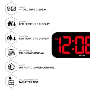 Chega de apertar os olhos! Verifique a hora em qualquer lugar da sala!! Precisa de um relógio que seja fácil de ler do outro lado da sala? O relógio de parede LED SHARP (SPC946AMZ) tem números grandes para que você possa vê-lo de qualquer ângulo. Os dígitos brilhantes o tornam visível à distância para que você possa verificar a data e a hora sem apertar os olhos. Basta ligar e montar o relógio em uma parede ou mesa. Os ajustes de horário de verão são simples com um botão na parte de trás do relógio que moverá o tempo +1/-1 hora com um único toque de um botão. Tela gigante com design fino e elegante mede 14,7 cm de altura, 35 cm de largura e 3,8 cm de profundidade. Kit de relógio LED perfeito para paredes da sua cozinha, decoração do quarto, porão, garagem, parede da sala de aula, estúdio, academia ou galpão. Grande visor de 10 cm de altura com números grandes e fáceis de ler e controle de intensidade de intensidade de luz de 3 passos. A tela fácil de ler tem calendário de 2,5 cm de altura e exibição de dia da semana e exibição de temperatura interna e externa de 2,5 cm para facilitar a visualização em todo o escritório, sala de aula ou sala de estar, temperatura interna e externa – O SHARP SPC946 é diferente da maioria dos outros relógios no mercado porque tem temperatura interna e externa. O sensor externo sem fio (incluído) transmite a temperatura externa para o relógio de parede digital SHARP SPC946. O sensor pode ser colocado em qualquer lugar dentro de 30 metros da unidade receptora. A tecnologia sem fio significa que nenhuma instalação de fio é necessária para a funcionalidade de temperatura externa. Aberturas para facilitar a montagem na parede e um suporte traseiro dobrável para colocação de mesa ou prateleira. A função de enrolar o cabo na parte de trás do relógio mantém qualquer cabo extra limpo e arrumado. Operado elétrico com bateria reserva. Lembra o tempo em caso de falta de energia com baterias de reserva opcionais. A função de reserva requer 2 pilhas alcalinas AAA (não incluídas) - Tela gigante com design fino e elegante mede 14,7 cm de altura, 35 cm de largura e 3,8 cm de profundidade. Kit de relógio LED perfeito para paredes da sua cozinha, decoração de quarto, porão, garagem, parede da sala de aula, estúdio, academia ou galpão - Tela grande de 10 cm de altura com números grandes e fáceis de ler e controle de intensidade de intensidade de luz de 3 passos. A tela fácil de ler tem calendário de 2,5 cm de altura e exibição de dia da semana e exibição de temperatura interna e externa de 2,5 cm para facilitar a visualização em todo o escritório, sala de aula ou sala de estar - Temperatura interna e externa – O SHARP SPC946 é diferente da maioria dos outros relógios no mercado porque tem temperatura interna e externa. O sensor externo sem fio (incluído) transmite a temperatura externa para o relógio de parede digital SHARP SPC946. O sensor pode ser colocado em qualquer lugar dentro de 30 metros da unidade receptora. A tecnologia sem fio significa que nenhuma instalação de fio é necessária para a funcionalidade de temperatura externa. - Aberturas na parte de trás do relógio para facilitar a montagem na parede e um suporte dobrável para colocação de mesa ou prateleira. A função de enrolar o cabo na parte de trás do relógio mantém qualquer cabo extra limpo e arrumado. - Operado elétrico com bateria reserva. Lembra o tempo em caso de falta de energia com baterias de reserva opcionais. A função de reserva requer 2 pilhas alcalinas AAA (não incluídas)