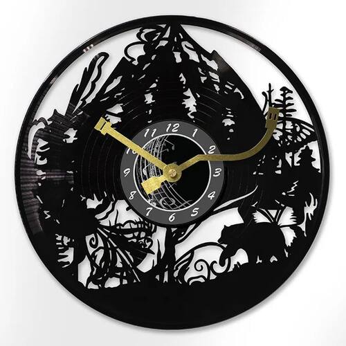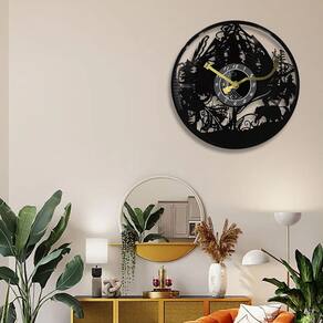 Material: Material da concha: metal Material do espelho: metal Material do mostrador: PVC Tamanho: 30 × 30 cm Peso: 2000 g Design exclusivo de paisagem florestal com silhuetas de árvores e vida selvagem, feito a partir de um disco de vinil para uma estética rústica inspirada na natureza. O movimento antiaderente de quartzo garante uma operação silenciosa, ideal para ambientes tranquilos em casa ou no escritório. Feito com mostrador de PVC durável e uma estrutura metálica para um design elegante e duradouro. Perfeito para amantes da natureza, entusiastas de atividades ao ar livre ou qualquer pessoa que queira adicionar um toque artístico ao seu espaço. Fácil de instalar, operado por bateria (AA), com um tamanho de 30 cm que se encaixa perfeitamente em qualquer parede.