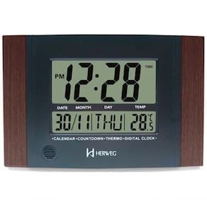 Relógio De Parede Ou Mesa Digital Lcd Calendário Termômetro Madeira Escura Herweg 6438 único Relógio de Parede ou Mesa Digital LCD Calendário Termômetro Madeira Escura Herweg 6438 único - Características Gerais do Produto: - Alimentação: Pilha AA ( não inclusa) - Funcionalidade: Visualização em 12h ou 24h; Termômetro; Termômetro com duas escalas; Calendário em Inglês; Timer; Alarme com melodia musical; Formato das Horas AM / PM; Visor LCD - Material: Plástico injetado pintado - Medidas: A: 19,0 x L: 28,8 x P: 2,6cm - Observações: Inclui suporte para pendurar ou pés para apoiar na mesa; Botões de regulagem na parte traseira - Modelo referência do produto: 6438-296 Garantia: - 12 Meses de Garantia de Fábrica