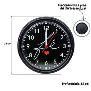 Este relógio de parede em particular possui um diâmetro de 24cm, o que o torna adequado para ser colocado em espaços menores ou para quem prefere um estilo mais discreto. Ele funciona com pilhas, o que o torna independente de uma fonta de energia elétrica direta e permite que seja colocado em qualquer lugar sem a necessidade de fios ou tomadas próximas.
