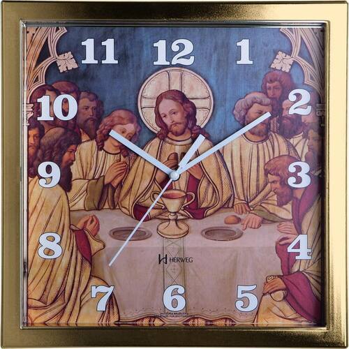 Relogio De Parede Quadrado Herweg Dourado Desenho Santa Ceia Relógio de Parede Silencioso sem tic-tac Herweg Modelo:660037-029 Estilo: Moderno quadrado Cor: Dourado Fundo: imagem da Santa Ceia Medidas: Altura: 28,5 cm Largura: 28,5 cm Relógio de parede Silencioso. Base em Plastico Injetado Botões de regulagem na parte traseira do produto Usa pilha AA 1,5V que não acompanha o produto