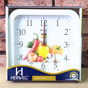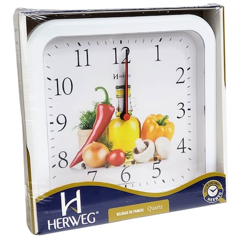 Marca: HERWEG Modelo: 660001 - 021 Tipo de relógio: Analógico Alarme: Não Cor da caixa: Branco Cor do fundo: Branco Tema: Legumes Material da Caixa: Polímeros diversos Características do vidro: Vidro Mineral Tamanho da caixa (A x L): 24 x 25 cm Espessura da caixa: 5 mm Peso: 323 Gramas Alimentação: 1 pilha1 AA 1,5 volt – a pilha não acompanha o produto Garantia do Fabricante: 12 meses Prazo de validade: Indeterminado Fabricante: HERWEG – Indústria Brasileira