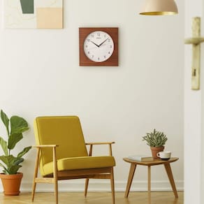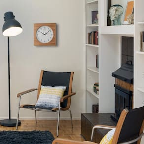 - O design Simplicity apresenta uma caixa quadrada de madeira clara aprimorada com folheado com padrão de madeira zebra