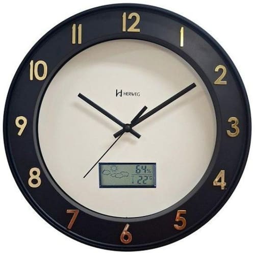 Relógio de parede termômetro e calendário preto fosco herweg 6855-262 único - Características gerais do produto: Acabamento / funcionalidades: preto Alimentação: pilha aa não inclusa Funcionalidade: mecanismo sweep ponteiro de segundos contínuo ; detalhe do mostrador em alto relevo; termômetro; mini estação meteorológica; higrômetro medição da umidade do ar Material: plástico pintado/injetado; visor em ps Medidas: a: 34,6 x l: 34,6 x p: 5cm Observações: inclui suporte para pendurar; botões de regulagem na parte traseira Modelo referência do produto: 6855-262 Atenção: este relógio não possui marcação de hora digital, nem mês e ano, somente temperatura e umidade do tempo. : 12 meses de de fábrica Marca: Não Informado