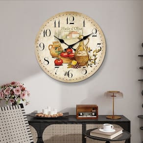 Material: Material da casca: madeira Material do espelho: Nenhum Material do mostrador: MDF Tamanho: 12 polegadas Peso: 560 g Design encantador inspirado na Provença com garrafas de azeite, tomates e ramos de oliveira para um toque rústico e mediterrâneo. O movimento silencioso e sem tique-taque de quartzo garante um ambiente silencioso, mantendo o tempo preciso. Material MDF durável com números grandes e fáceis de ler, tornando-o uma peça funcional e decorativa. Ideal para cozinhas, salas de jantar ou espaços com temas mediterrâneos, adicionando uma atmosfera aconchegante e acolhedora a qualquer ambiente. Belas obras de arte combinadas com praticidade, perfeitas para adicionar um toque rústico à sua casa ou restaurante.