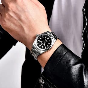 Construído com materiais de primeira qualidade, o estojo e a pulseira em aço inoxidável oferecem durabilidade e resistência ao desgaste, garantindo um visual sofisticado por muitos anos. Sua resistência à água proporciona versatilidade, permitindo que você o use com confiança em ambientes úmidos e atividades aquáticas leves.