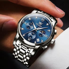 OLEVS Relógio masculino azul cronógrafo luxuoso fase da lua grande aço inoxidável à prova d'água luminoso negócios prata relógio de pulso masculino - Relógios OLEVS masculinos: movimento japonês importado, bateria de alta qualidade, relógio romano com mostrador analógico, hora precisa, pode atender a várias necessidades em sua vida diária e trazer comodidade. - Relógio masculino multifuncional: relógio masculino com cronógrafo com três submostradores, mostrando 60 segundos, 60 minutos e uma janela de calendário à direita. O estilo de design é simples, , clássico e generoso. - Relógio de aço inoxidável: pulseira preta de aço inoxidável 316L, relógio de pulso masculino de negócios, ótimo para pulsos grandes, bom relógio de luxo para homens. Ferramenta de ajuste de pulseira de aço inoxidável, o comprimento do relógio de pulso masculino pode ser ajustado de acordo com o tamanho do pulso. - Relógio luminoso/impermeável: 3 ATM à prova d'água atende às necessidades diárias à prova d'água. A função luminosa pode ler o relógio no ambiente escuro. É um relógio essencial para homens maduros. - Relógios OLEVS Moon Phase: devolução de 30 dias e garantia de 12 meses. Se você tiver alguma dúvida sobre o produto, comigo imediatamente e lhe daremos uma solução satisfatória.