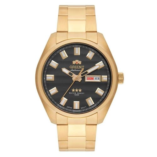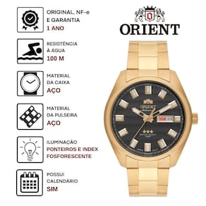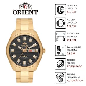 Relógio Orient Masculino Automático Dourado 469GP076FMarca: OrientModelo: 469GP076FTipo de mostrador: AnalógicoMecanismo: AutomáticoAlimentação: Movimento do pulsoFormato da Caixa: RedondoCor da caixa: DouradoCor da pulseira: DouradoMaterial do Vidro: Cristal MineralMaterial da caixa: Aço InoxMaterial da pulseira: Aço InoxTipo de Fecho: DobrávelNível de Resistência à Água: 100 MetrosCalendário: SimCronômetro: NãoAlarme: NãoLuz noturna: Não Medidas:Diâmetro da Caixa: 4,1 cmEspessura da Caixa: 1,3 cmLargura da Pulseira: 2,1 cmTamanho da pulseira: 21 cmPeso do Relógio: 134 gConteúdo da Embalagem:Estojo da MarcaAcessórios (correspondentes a cada modelo)Manual em PortuguêsCertificado de 01 ano junto ao FabricanteNota Fiscal Eletrônica Fornecedor: Orient Relógios da Amazônia LTDA. CNPJ:05.830.195/0001-10
