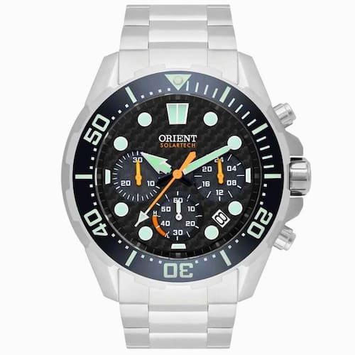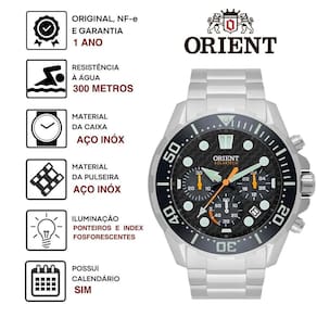 Marca: Orient Modelo: MBSSC260 P1SX Tipo de mostrador: Analógico Cor do Mostrador: Preto com Ponteiros e Inex Prata Mecanismo: SolarTech Alimentação: Solar Formato da Caixa: Redondo Cor da caixa: Prata Cor da pulseira: Prata Material da caixa: Aço Inoxidável Material da pulseira: Aço Inoxidável Tipo de Fecho: Dobrável com botão Resistência à Água: 300 Metros Funções: aro rotativo unidirecional Calendário: Sim Cronômetro: Sim Alarme: Não Luz noturna: Ponteiros e Index Fosforescentes