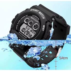 Design e Materiais: Possui corpo e pulseira de resina preta ou poliuretano PU , com caixa redonda de plástico ABS. A resistência à água é de 5 ATM, permitindo o uso para natação em águas rasas, mas não para mergulho.