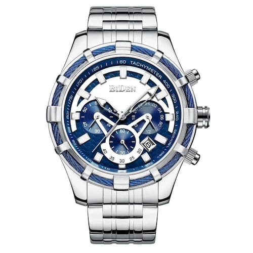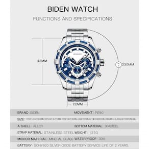 Relógio De Pulso, Quartzo, Analógico, Pulseira De Aço, Cronógrafo Prata Detalhes Espessura do estojo 12 Largura de banda 22 Tipo de matéria da pulseira STAINLESS STEEL Formato do Estojo Redondo Tipo de material do visor Hardlex Material das Caixas e Estojos Papel Número do modelo 0117 Diâmetro do visor 42 Característica Cronômetro,À prova de choque,Data automática,Calendário completo,À Prova DÁgua,luminous hands Profundidade de resistência à água 3Bar Fecho Bracelete de fecho Comprimento da pulseira 23 Material do estojo LIGA Movimento QUARTZ Estilo Luxury/ru Tipo de Item Relógios de Pulso de quartzo Nome da marca BIDEN