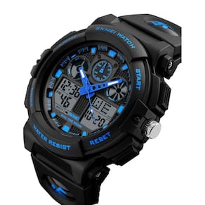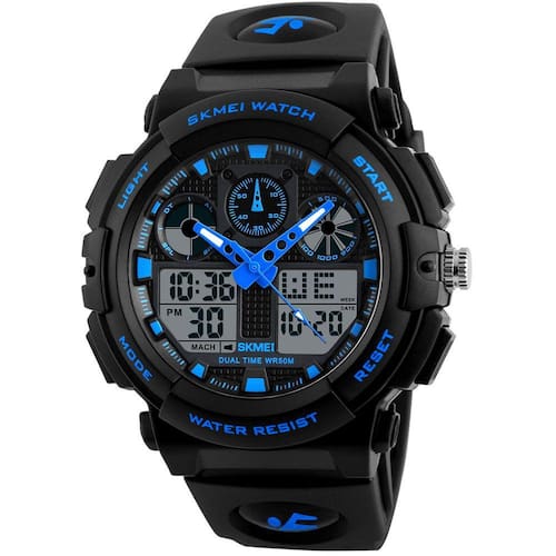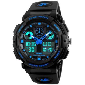 Descrição: - O display digital e analógico facilita muito a contagem das horas. - Função de alarme, exibição de dia e data. - A luz de fundo permite que você saiba a hora claramente no escuro. - Cronógrafo de 1/100 segundo. - Resistente à água até 5 ATM. Especificações: - Tipo de tela: LCD e analógico - Diâmetro da caixa do relógio: 2,0" - Espessura da caixa: 0,7" - Comprimento da pulseira (caixa incluída): 9,8" - Largura da pulseira: 1,2" - Material da pulseira: borracha - Material da caixa: plástico