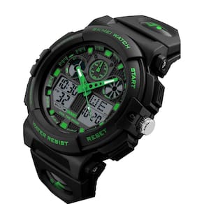 Descrição: - O display digital e analógico facilita muito a contagem das horas. - Função de alarme, exibição de dia e data. - A luz de fundo permite que você saiba a hora claramente no escuro. - Cronógrafo de 1/100 segundo. - Resistente à água até 5 ATM. Especificações: - Tipo de tela: LCD e analógico - Diâmetro da caixa do relógio: 2,0" - Espessura da caixa: 0,7" - Comprimento da pulseira (caixa incluída): 9,8" - Largura da pulseira: 1,2" - Material da pulseira: borracha - Material da caixa: plástico