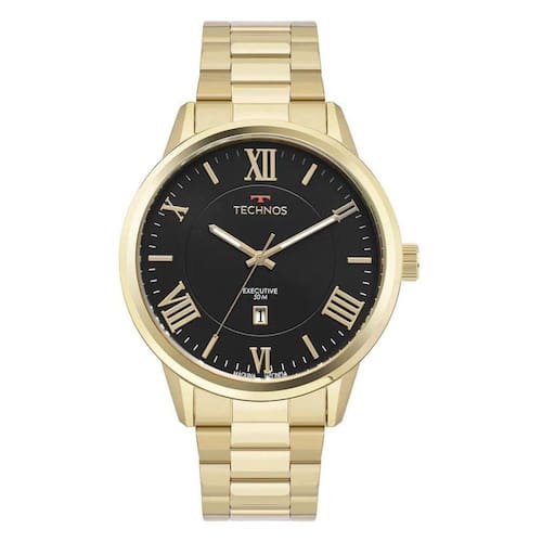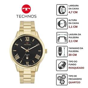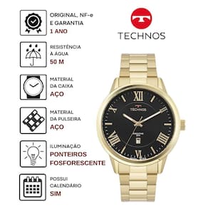 Relógio Technos Masculino Executive Classic Dourado 2115MTY/1P Marca: TechnosModelo:2115MTY/1PLinha/Coleção: ExecutiveTipo de mostrador: AnalógicoMecanismo: QuartzoAlimentação: BateriaFormato da Caixa: RedondoCor do mostrador:Preto com Ponteiros e Indec DouradoCor da caixa: DouradoCor da pulseira: DouradoMaterial do Vidro: Cristal MineralMaterial da caixa: Aço InoxMaterial da pulseira: Aço InoxTipo de Fecho: dobrável com 2 botõesNível de Resistência à Água: 50 MetrosCalendário: SimCronômetro: NãoAlarme: Não Luz noturna: Ponteiros FosforescenteMedidas:Diâmetro da caixa: 4,7cmEspessura da caixa: 1,1 cmLargura da pulseira: 2,1cmTamanho da pulseira:20cmPeso do relógio: 125gConteúdo da Embalagem:Estojo da MacaAcessórios (correspondentes a cada modelo)Manual em PortuguêsCertificado de 01 ano junto ao FabricanteNota Fiscal Eletrônica O Grupo Technos assegura o perfeito funcionamento do seu relógio pelo período de 01 ano em todo território nacional, caso o seu produto apresente algum defeito, encaminhe diretamente à assistência técnica mais próxima de sua região, sempre acompanhado da documentação recebida.