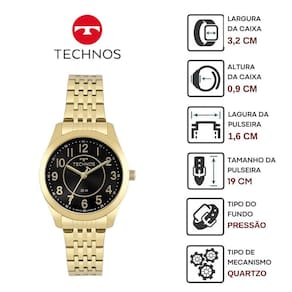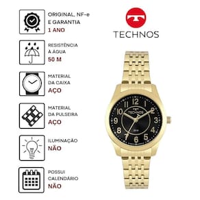 Relógio Technos Feminino Analógico Elegance Boutique Dourado 2035MJDS/4P Relógio Technos Feminino Analógico Elegance Boutique Dourado, sofisticação e glamour em suas mãos. Pulseira em aço inoxidável, caixa dourada e mecanismo preciso. Adquira o seu agora e brilhe em grande estilo.Marca: TechnosModelo: 2035MJDS/4PLinha/Coleção: EleganceTipo de mostrador: AnalógicoMecanismo: QuartzoAlimentação: BateriaFormato da Caixa: RedondoCor do mostrador: Preto com index e ponteiros na cor douradaCor da caixa: DouradoCor da pulseira: DouradoMaterial da caixa: Aço InoxMaterial da pulseira: Aço InoxTipo de Fecho: Dobrável com 2 botõesResistência à Água: 50 MetrosCalendário: NãoCronômetro: NãoAlarme: NãoLuz noturna: Não Medidas:Diâmetro da caixa: 3,2cmEspessura da caixa: 0,9cmLargura da pulseira: 1,6cmTamanho da pulseira: 19cmPeso do relógio: 74g Conteúdo da Embalagem:Estojo da MarcaAcessórios (correspondentes a cada modelo)Manual em PortuguêsCertificado de 01 ano junto ao FabricanteNota Fiscal Eletrônica O Grupo Technos assegura o perfeito funcionamento do seu relógio pelo período de 01 ano em todo território nacional, caso o seu produto apresente algum defeito, encaminhe diretamente à assistência técnica mais próxima de sua região, sempre acompanhado da documentação recebida Ean: 7891530721731