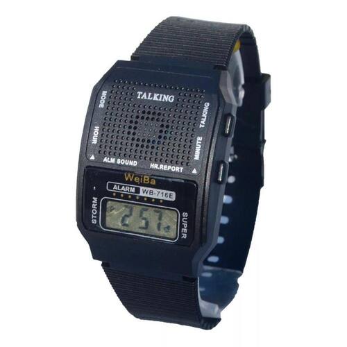 Relógio De Pulso Unissex Fala A Hora Em PortuguêsInformações do produtoTalking - Relógio digital que fala as horas Ideal para deficientes visuais ou idososÓtima escolha para presentesEspecificações:Cor: PretaPulseira: EmborrachadaManual em português e inglêsPossui:- Programação para despertador- Configuração para falar de hora em hora- Voz em portuguêsComprimento: 24Largura: 11Altura: 2Peso: 100 gramas Marca: Weiba