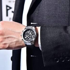 Este robusto relógio masculino combina a precisão de um mecanismo de quartzo com a funcionalidade de um cronógrafo em um design esportivo e moderno. O mostrador dinâmico oferece função de cronógrafo, permitindo cronometrar eventos e realizar medições com facilidade.