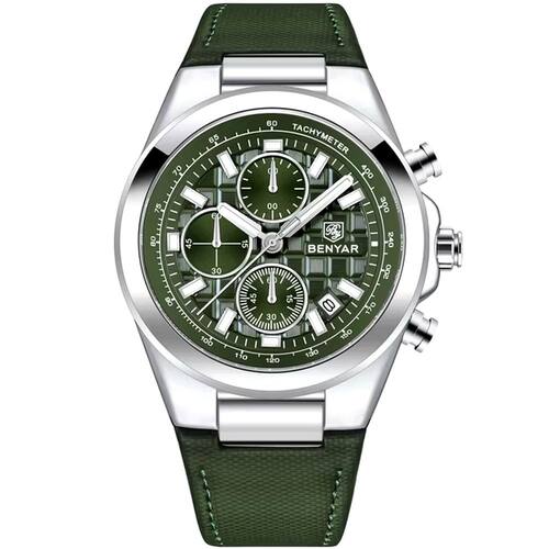 Este robusto relógio masculino combina a precisão de um mecanismo de quartzo com a funcionalidade de um cronógrafo em um design esportivo e moderno. O mostrador dinâmico oferece função de cronógrafo, permitindo cronometrar eventos e realizar medições com facilidade.