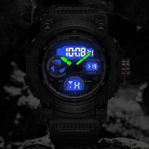 Especificações: [Materiais Premium] A pulseira de silicone é ível e resistente, proporcionando conforto e durabilidade. [Iluminação e Visibilidade] Com recursos de luz de fundo e display de LED, você pode verificar o horário até nas condições mais escuras. Este relógio clareza com estilo. [Resistência à Água] Com resistência de 5 bar, este relógio é perfeito para atividades aquáticas do dia a dia, como natação e mergulho leve. [Design e Funcionalidade] Com um cronógrafo para medir com precisão e uma função de calendário automático, este relógio é bastante versátil. [Estilo Moderno] A combinação de mostradores luminosos e um design contemporâneo faz dele um item must-have na coleção de acessórios de qualquer pessoa antenada nas tendências.