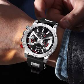 Especificações: [Espessura do Estojo:] Com uma espessura de 13mm, o estojo deste relógio oferece uma robustez que se destaca, sem comprometer a elegância.[Material da Pulseira:] A pulseira é fabricada em silicone premium, proporcionando conforto inigualável e um toque moderno.[Formato do Estojo:] O formato redondo confere um visual clássico e sofisticado, gracioso para qualquer estilo.[Luminous Hands:] Este relógio brilha literalmente no escuro com ponteiros luminosos que garantem visibilidade máxima, mesmo em ambientes pouco iluminados.[Cronógrafo e Outros:] Equipado com funções de cronógrafo e data automática, suas funcionalidades são perfeitas para um dia rápido e cheio de estilo.