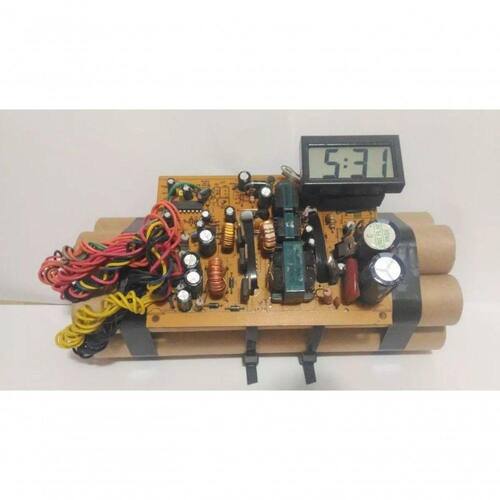 Relógio Decorativo de Mesa Simulacro Bomba único - Características Gerais do Produto: - Acabamento / funcionalidades: Produzido artesanalmente - Alimentação: Bateria 1,5 V ( não inclusa) - Material: Tubos de papel Kraft; Circuito danificado; Mecanismo de relógio digital; Cintas plásticas e cola - Medidas: 23 x 09cm - Observações: roduto decorativo não perecivel. As fotos são meramente ilustrativas e o modelo disponível em estoque pode variar o modelo conforme disponibilidade, jáque se trata de um produto artesanal que utiliza peças e circuitos descartados. - Modelo referência do produto: 722 Garantia: - 12 Meses de Garantia de Fábrica