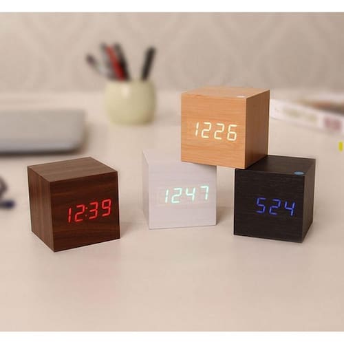 Relógio Despertador Digital Cubo Led Mesa Sound Control Descrição Relógio de mesa com design tipo madeira em 3lindos modelos. Apresenta dígitos grandes para fácil visualização, Possuí a Função Voice Control, basta bater palma ou tocar no aparelho que as horas aparecem no visor Especificações/Características do Produto - Material: Plástico com revestimento em um laminado que imita madeira - Cor da tela LED: Vermelho, Branco, Amarelo, Azul, Verde envio aleatório conforme disponibilidade em - Visor 1: Hora e temperatura comutação automática - Exibição 2: Hora exibição padrão - Fonte de Alimentação: Cabo usb ou 3 pilhas AAA não inclusas - Dimensões: 6,3x 6,3x 6,3 cm - Peso líquido: 123g - Relógio com função: 12 hou 24 h - Função Sound Control: Quando ativado o visor desliga para economizar pilhas e liga automaticamente se bater palmas ou tocar no relógio - Alarme Itens inclusos - 1Relógio digital - 1 Cabo USB Atenção 1- O cliente tem até 7 dias corridos, após o recebimento, para devolução do produto artigo 49 2 -Lembrando que o produto deve retornar sem defeitos 3 -Imagem Meramente ilustrativa Ean: 7899209827197
