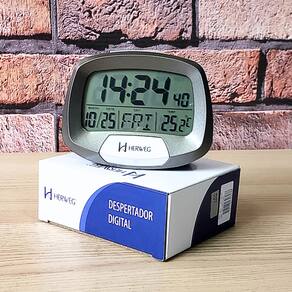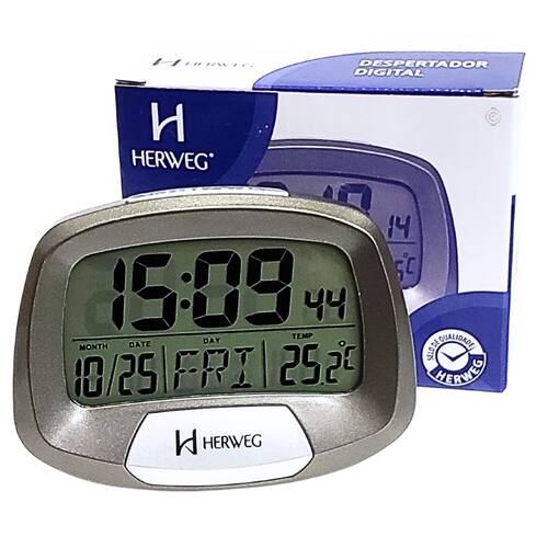 Marca: HERWEG Modelo: 2977 Tipo de relógio: Digital Alarme: Sim Termômetro: Sim Calendário: Sim Cor da caixa: Cinza Metálico Cor do fundo: Display Material da Caixa: Polímeros diversos Características do vidro: Vidro Mineral Tamanho da caixa (A x L): 9 x 11 cm Espessura da caixa: 38 mm Peso: 102 Gramas Alimentação: 2 pilhas AAA 1,5 volt – a pilha não acompanha o produto Garantia do Fabricante: 12 meses Fabricante: HERWEG – Indústria Brasileira